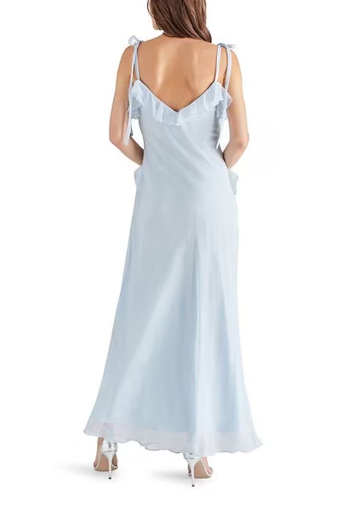 Be the center of attention in the stunning Adalina Dress. This dress features a v-neckline and ruffle detail that will make you stand out on any occasion. With its sleeveless design. this maxi dress is the perfect addition to your wardrobe.