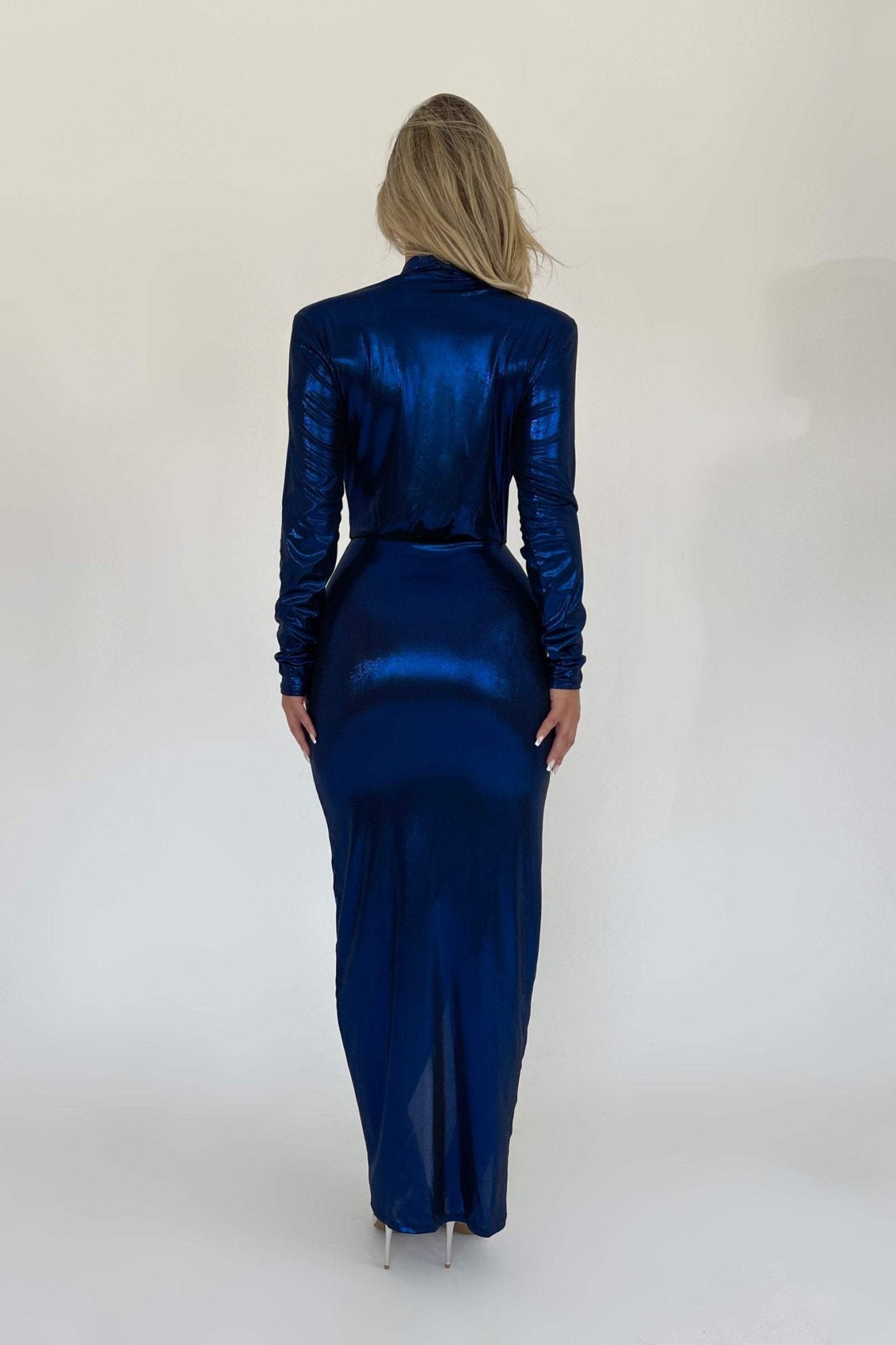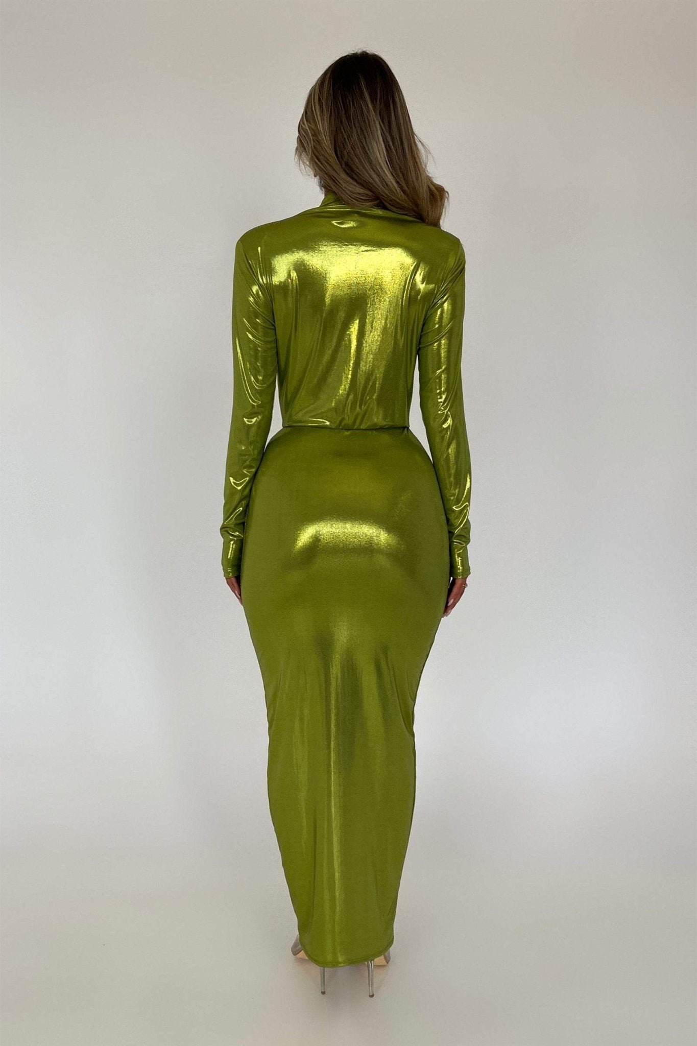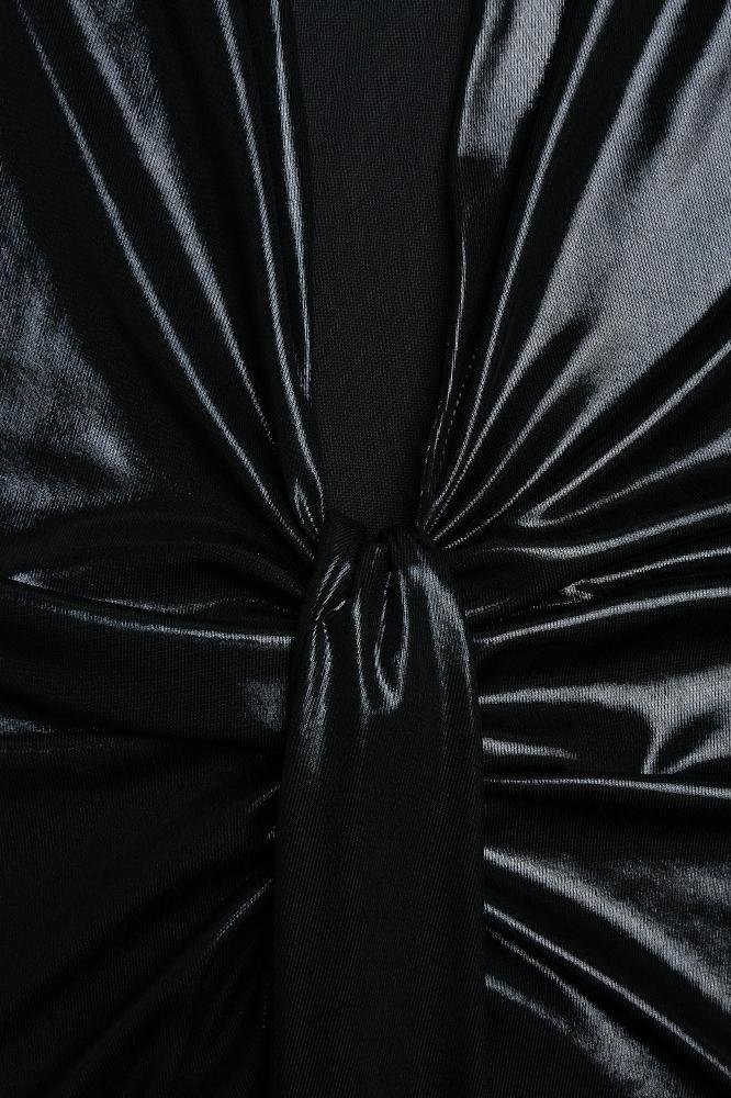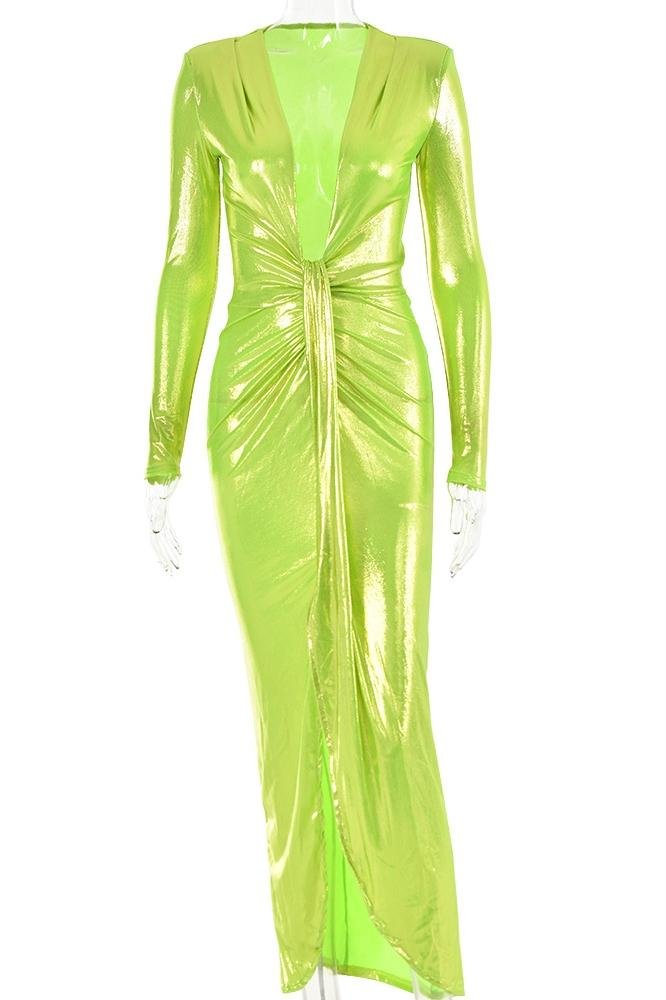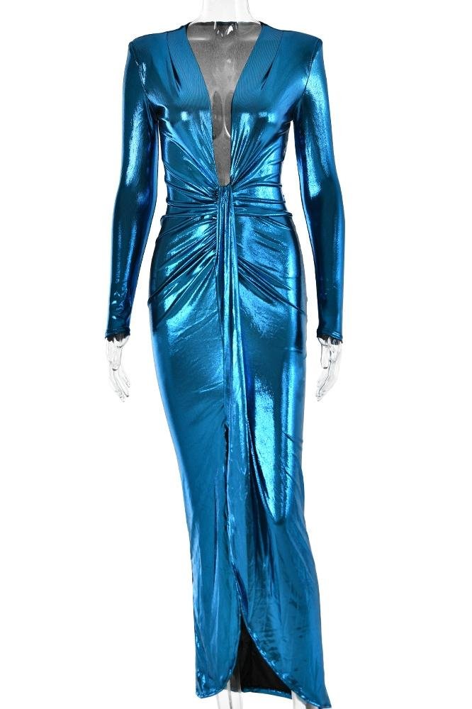 • High Shine Metallic Fabric, Deep V-neck, High Slit, Knot Waist Line.
