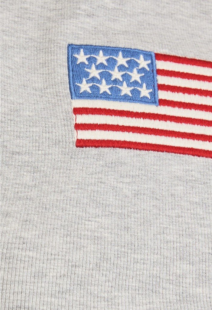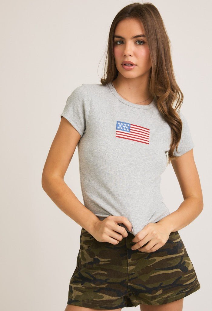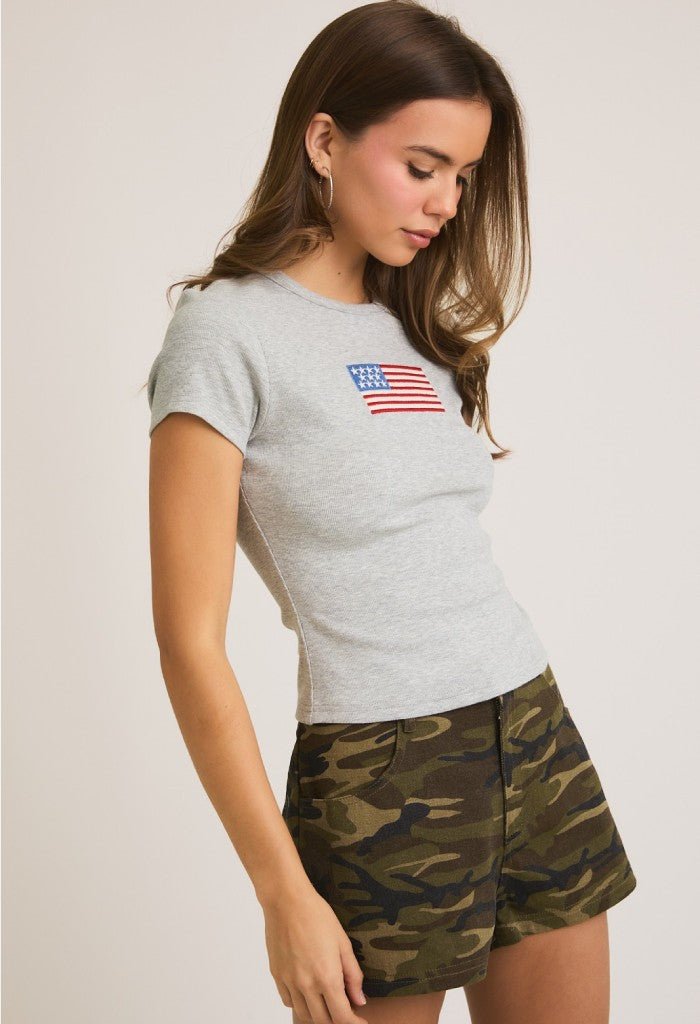 • Feel cute and comfortable in the American Honey Tee. This sweet top features short sleeves and a classic USA flag for a look that’s functional and fashionable. Pair with your fave cargos or cutoff shorts when you’re on-the-go!