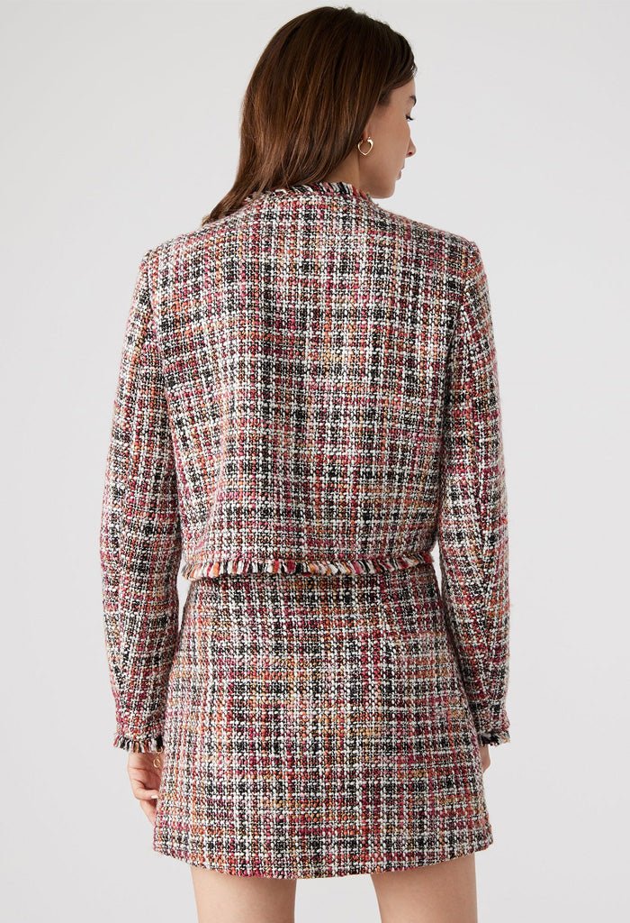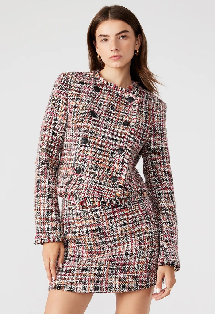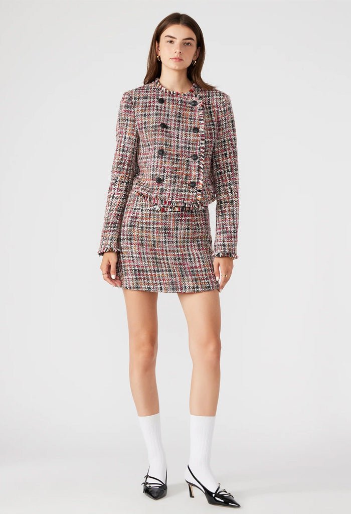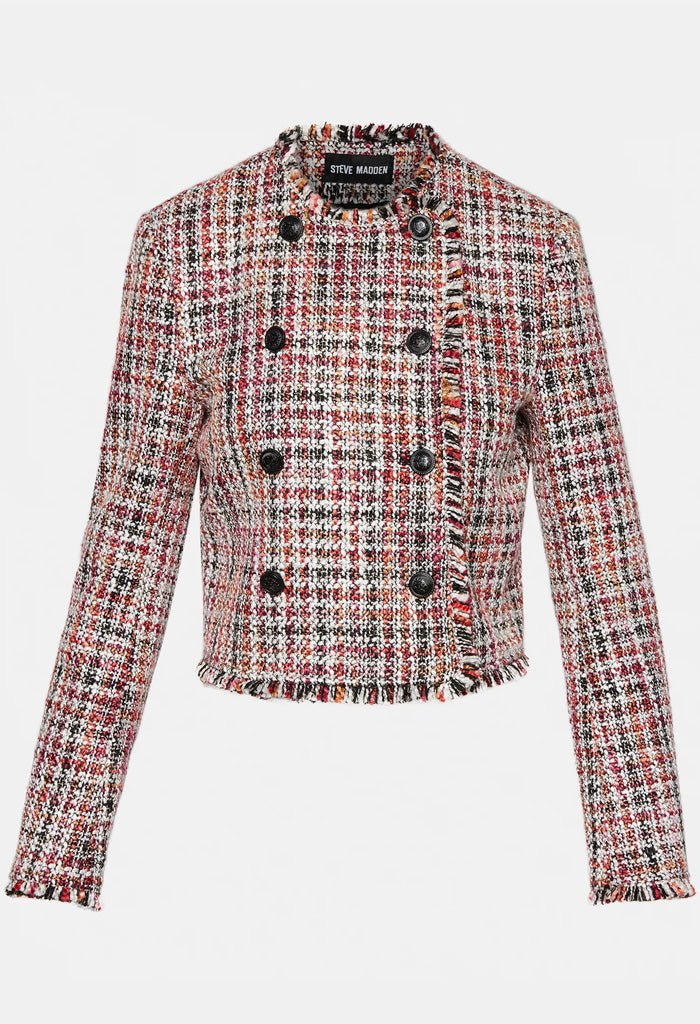 Introducing the Antoinette Jacket – a stylish collarless tweed blazer that exudes sophistication. The fray hem detail trim adds a touch of elegance. while the double-breasted design is adorned with an animal crest button for a unique touch. With shoulder pads and a fully lined interior. this jacket looks great and provides a comfortable fit. Elevate your wardrobe with this must-have piece.