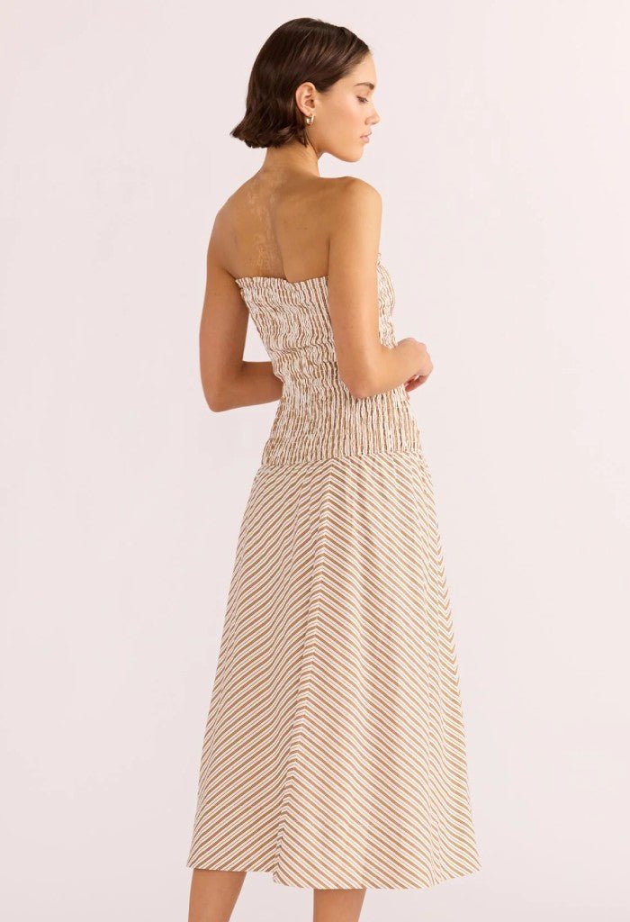 The Artemis Shirred Midi Dress features a classic tan stripe. and is crafted with a cotton-linen fabrication in a ruched. elasticated bandeau body and a-line skirt style. Perfect for beach to bar dressing. Pair yours with a chunky slide. or barely-there heel to complete the look.