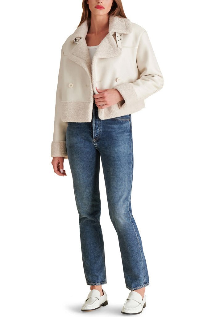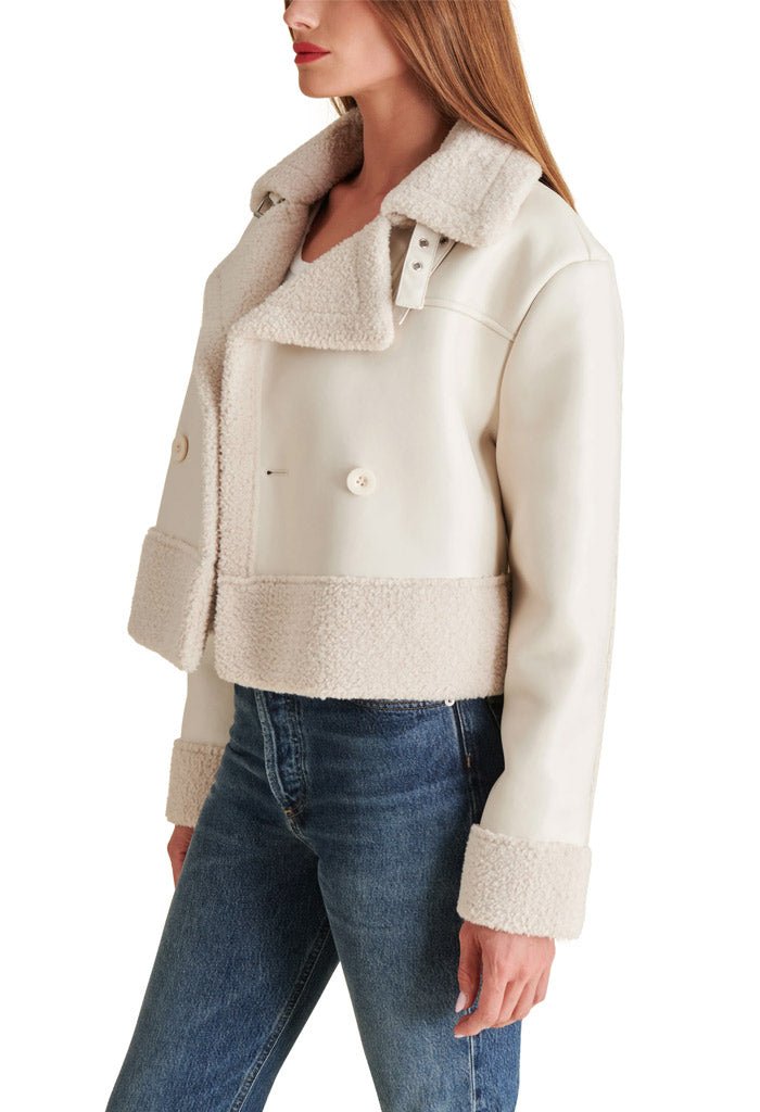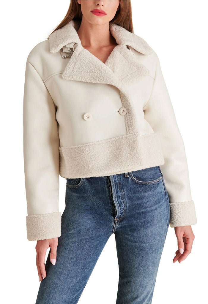Expertly crafted. the Athen Jacket is a timeless piece that offers both style and functionality. Its double-breasted design adds an elegant touch. while the boxy oversized fit and cropped length provide a modern twist. The faux shearling trim not only adds texture but also provides warmth. The functional collar belt and stabilizing buttons make this jacket a practical choice for any occasion.