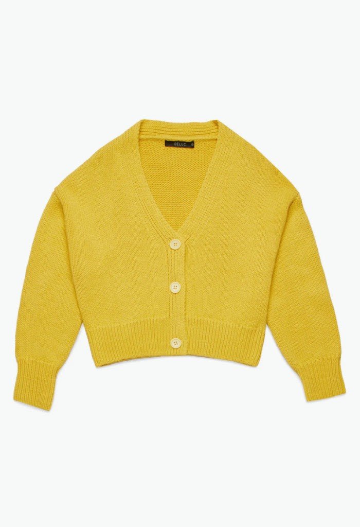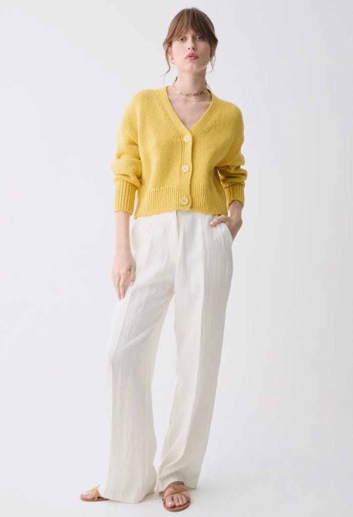 • Invigorate your day with a pop of color in this chunky cotton-blend cardigan knit in a boxy profile and a cropped length that’s ideal with your high-waist looks.