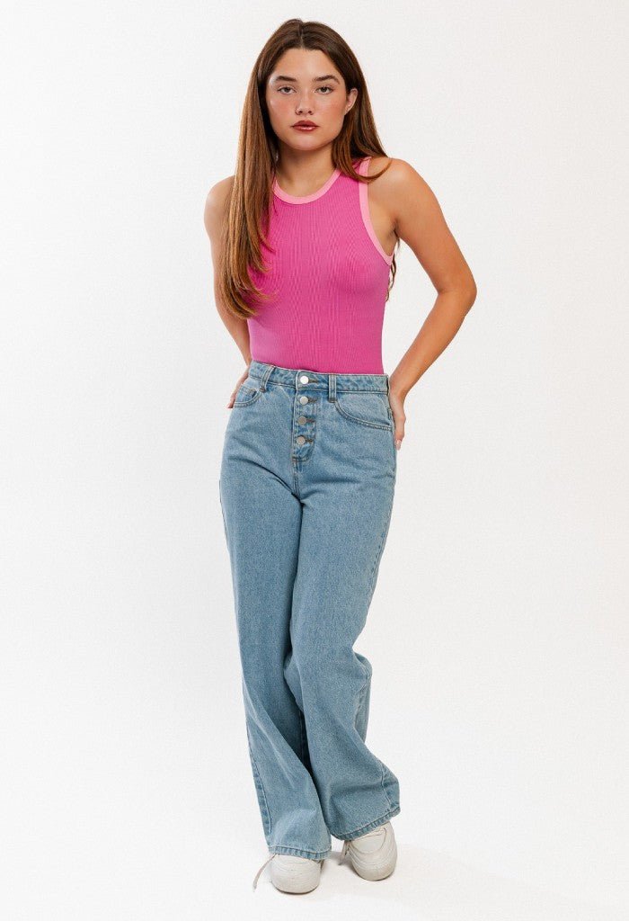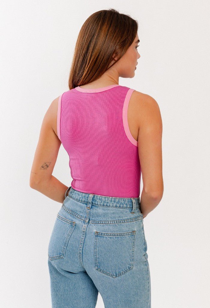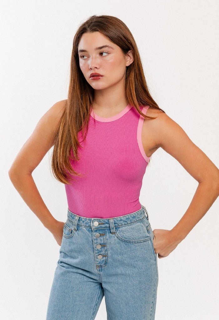 Come on. Barbie! Let’s go party in this sweet bodysuit. A comfy rib knit and cool color-blocked design makes this perfect to wear when you’re on the go. Tuck it into your favorite skirts or high waisted denim.