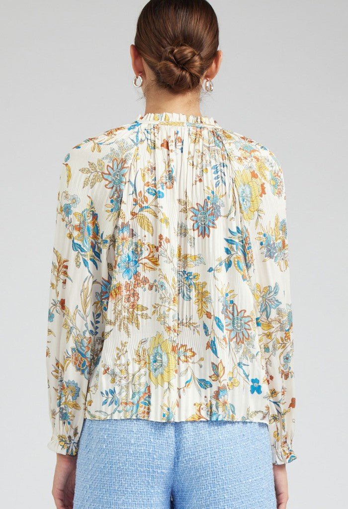 • Bring in spring with the Bardot Blouse! Adorned with fresh florals. this sweet pleated top is perfect to wear from day to night. Pair with oversized sunnies. distressed jeans. and wedges for an effortlessly chic bohemian vibe.