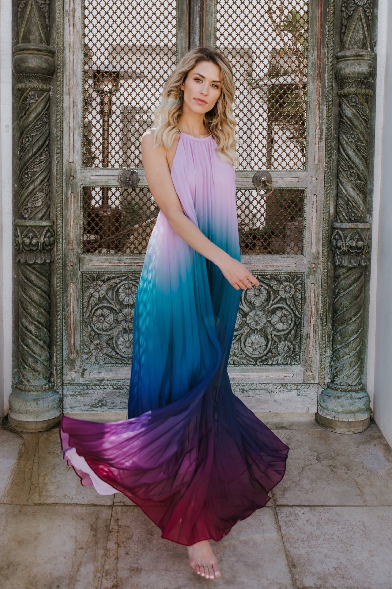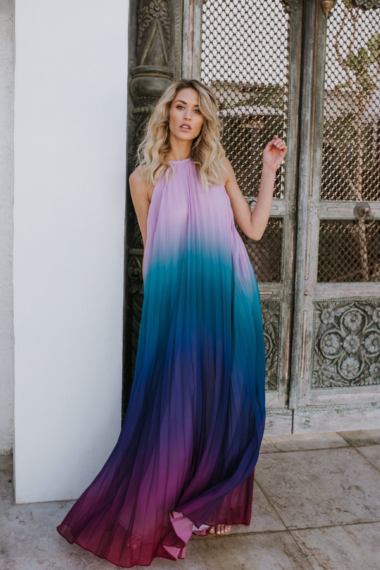 - Gradient Color Printed, Plisse, Halterneck, Tent Dress, Floor Length.