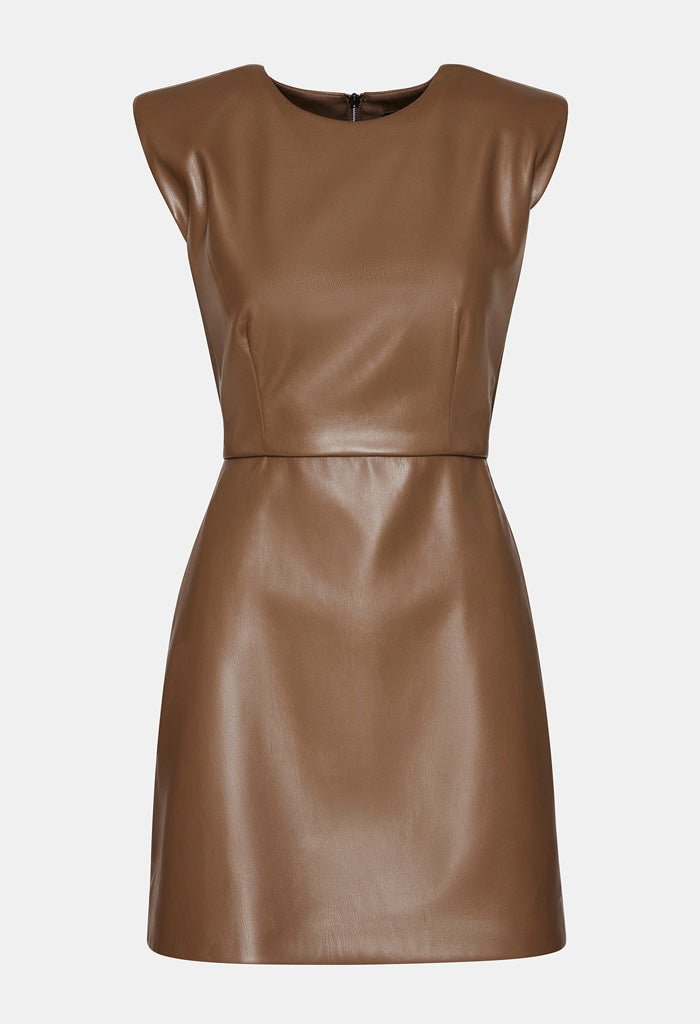 Indulge in luxury with our Belen Dress. This mini dress features a lined bodice for easy fitting. convenient pockets. and subtle shoulder pads. The stretchy elastic back and center-back logo zipper add a touch of sophistication to this piece.
