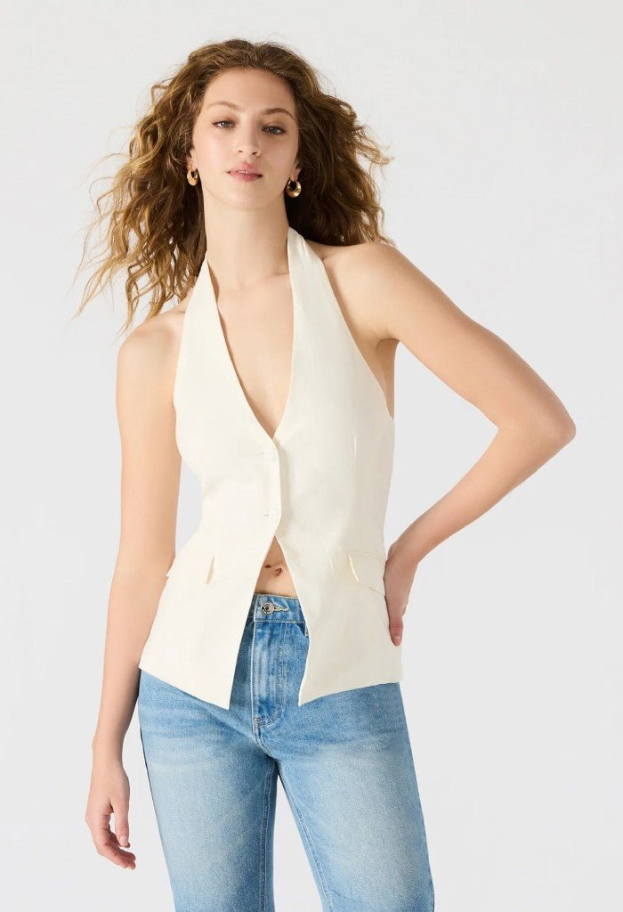 Sophisticated and chic. you’ll look elegant as can be in Brielle Vest. This timeless vest features a sleek halter neck with faux front pockets and button-closure. Slip it on over a stylish blouse for work or wear as-is with your fave denim for brunch with the girls.