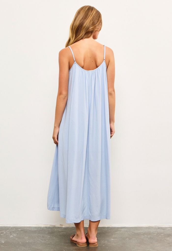 Go with the flow in this sweet dress. Simple and sweet. this adorable dress features a relaxed fit with spaghetti straps and pockets. Throw it on with tennis shoes while running errands or pair with an oversized hat and sandals for a beach day.