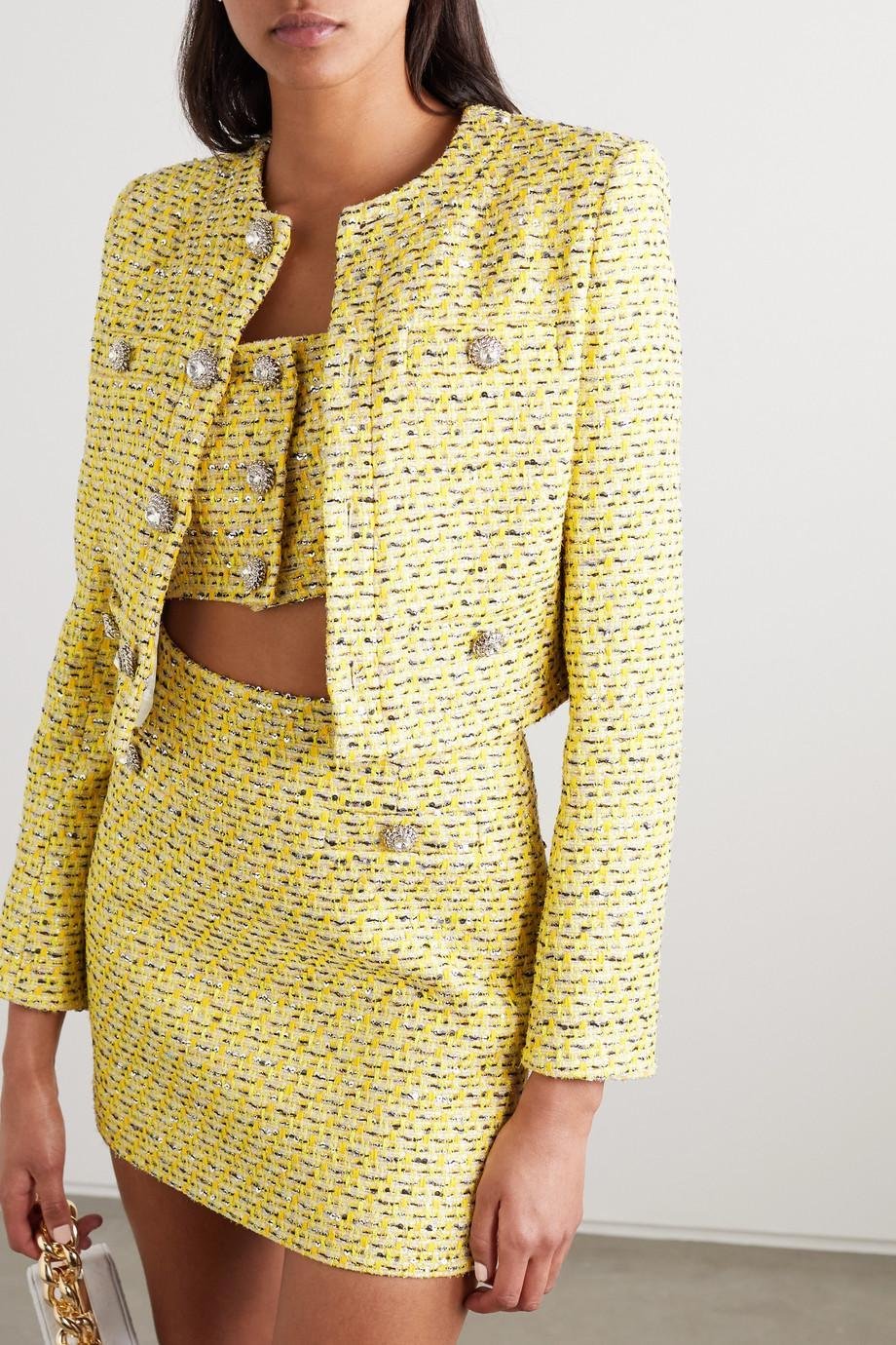 - Three-piece Set, Mini Skirt, Crop Top, Diamante Button.