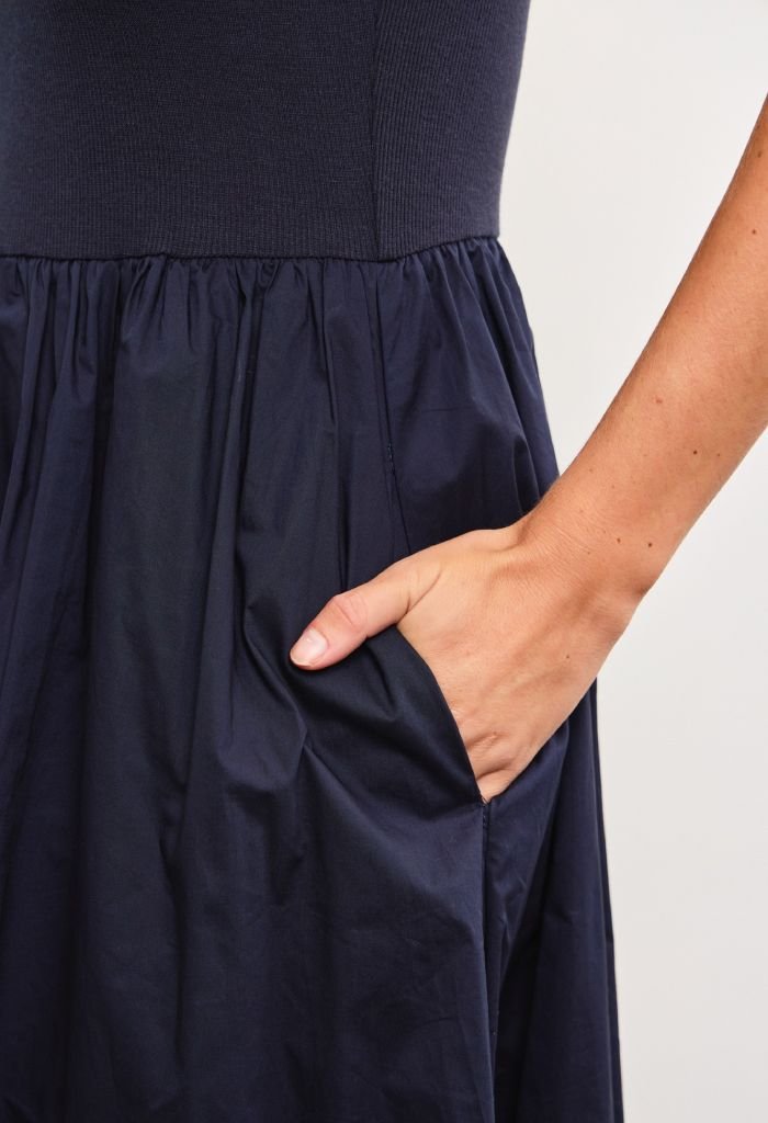 Meet your new one-and-done outfit. This sweet midi dress features a mixed media design with a rib knit bodice. flared skirt. and pockets! Throw it on with a denim jacket and wedges or tennis shoes for an effortlessly chic look.