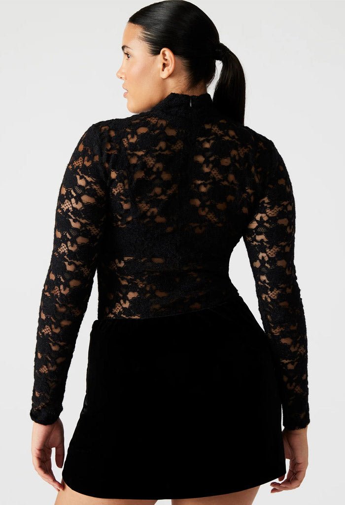 Expertly crafted for comfort and style. the Cassie Bodysuit is a must-have addition to any wardrobe. Featuring a mock neck and bodycon fit. this long-sleeved sheer bodysuit is designed with a delicate mesh lace for a touch of elegance. The bottom snap closure provides a seamless and secure fit for all-day wear.