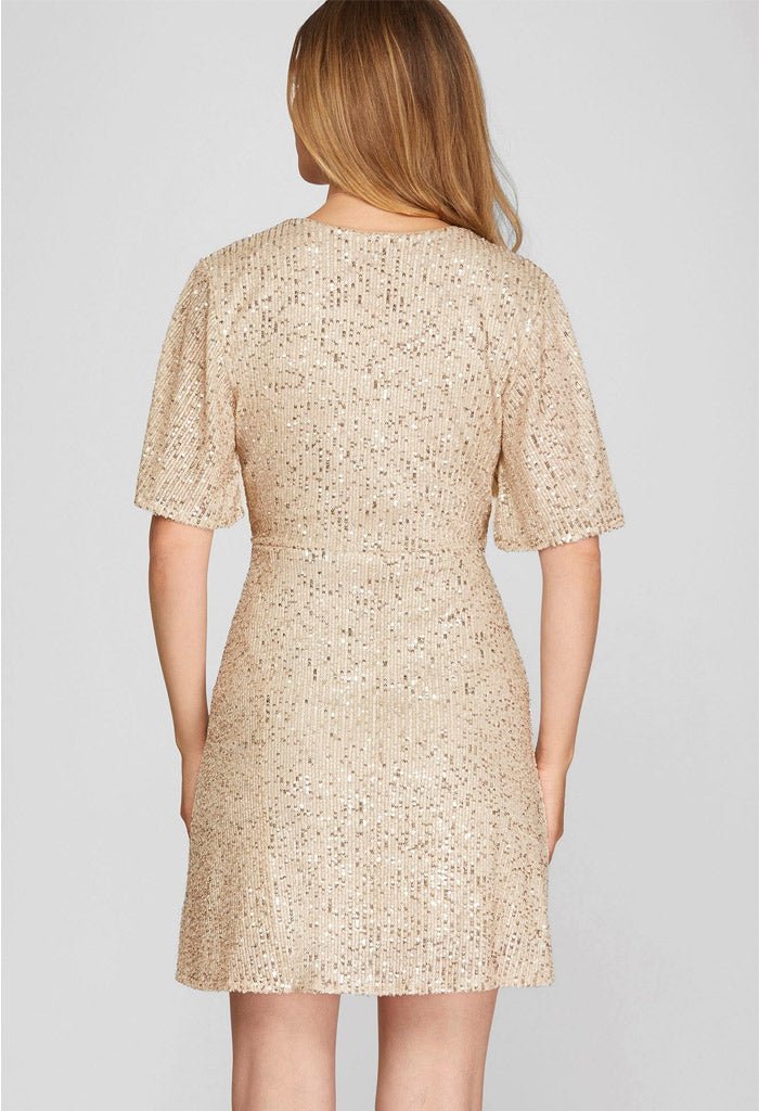 • Shimmer and shine this holiday season in the Catherine Dress. A universally flattering wrap design makes this dress functional and fashionable while metallic sequins add a dash of sparkle. Slip it on with cute hoops and chic heels for your next soirée.