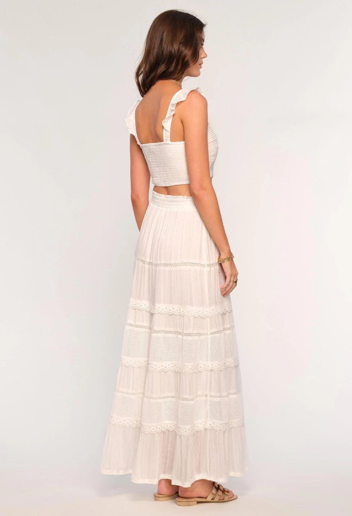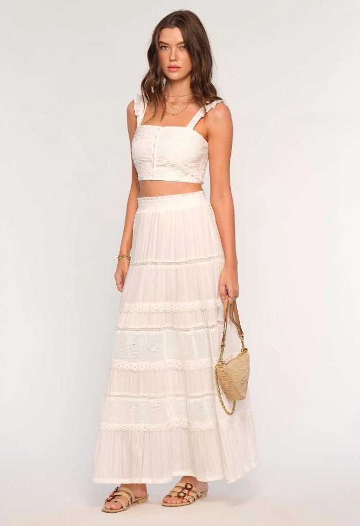 The Cece Set is made from a washed cotton voile and has so many pretty details. The bodice is a slim fit with pintucks. eyelet insets and flutter straps. The full skirt hits at the ankle and has pintucks and lace trim.