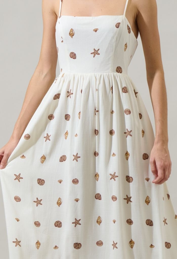 • Sun. sand. and sea are calling – answer in the Cerise Midi Dress! Effortlessly cool. this sweet dress features an adorable seashell print with spaghetti straps and a smocked back. Slip it on with an oversized hat. stylish sunnies and sandals for your next beach day.
