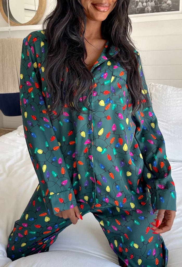 Sleep tight in these super silky button down pajamas! Sold as a set. these festive printed pjs have a drawstring and elastic waist.