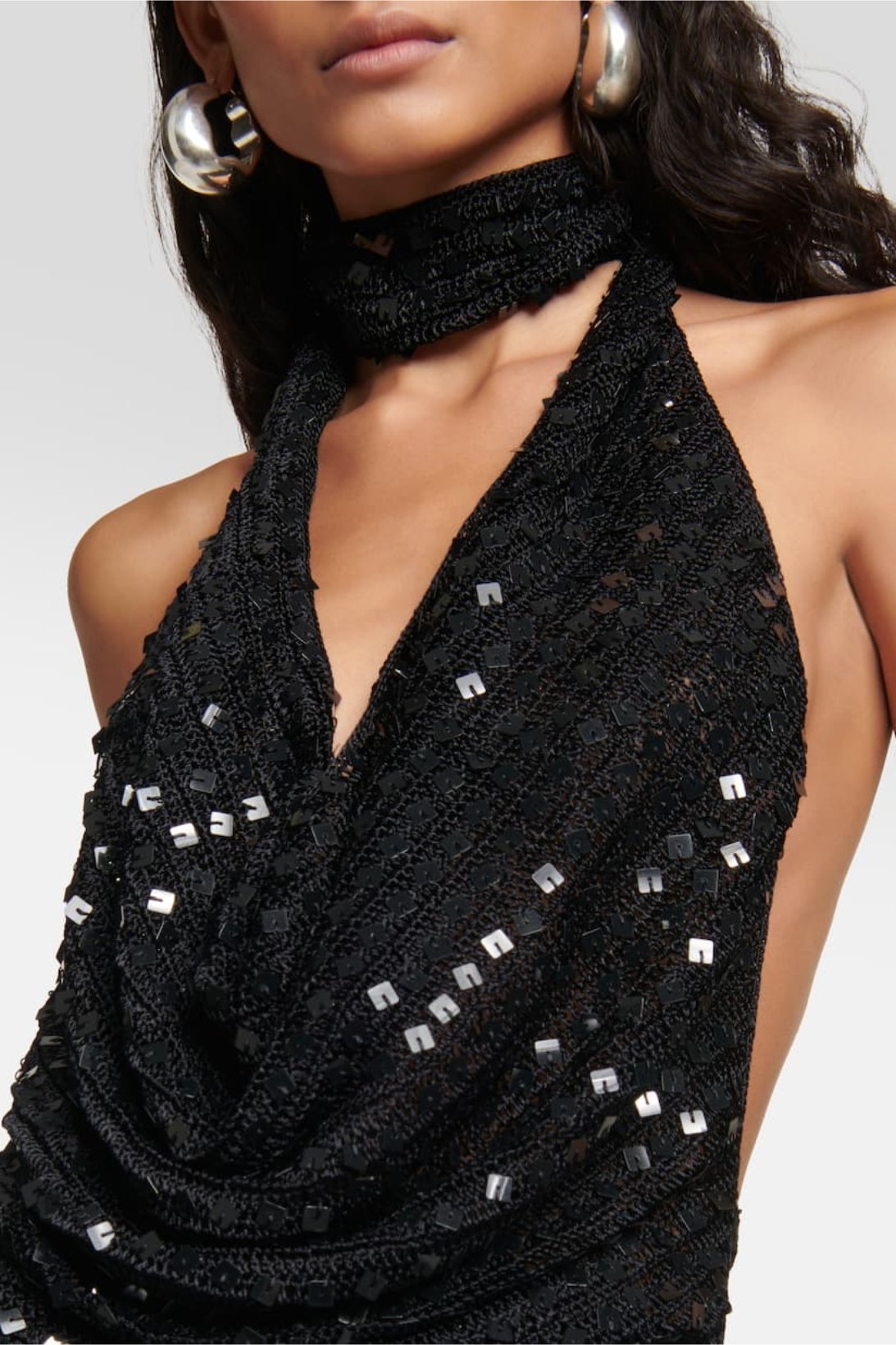 - Deep V-neck Halterneck, Sequins Crochet, Backless with Strap.