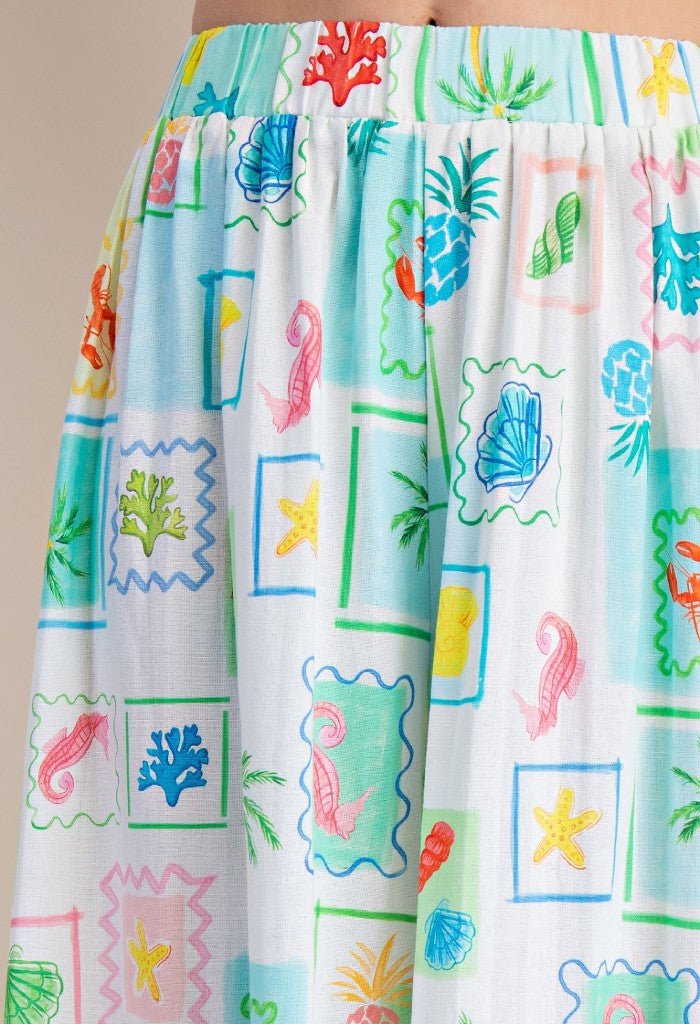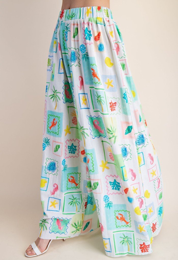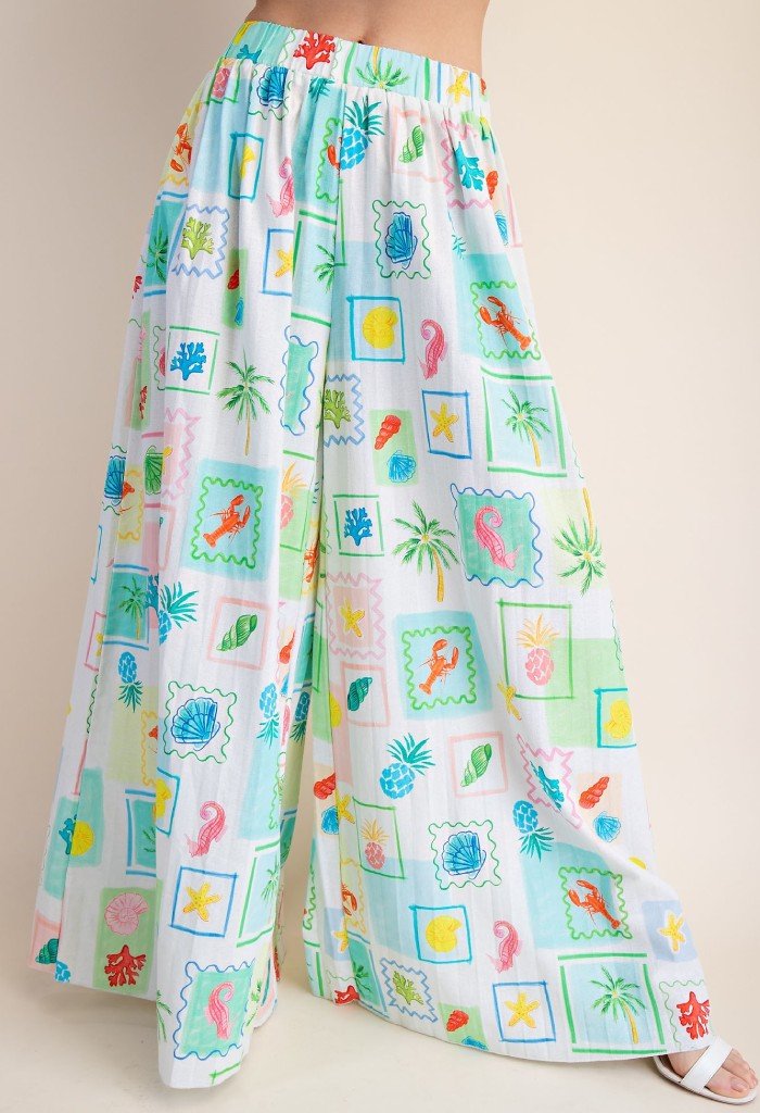 • Feel easy breezy in our Coastal Dream Pleated Pants. These stylish wide leg pants features an elasticized waist and tropical postcard print. Slip them on with the Coastal Dream Pleated Top and sandals for an effortlessly chic look.