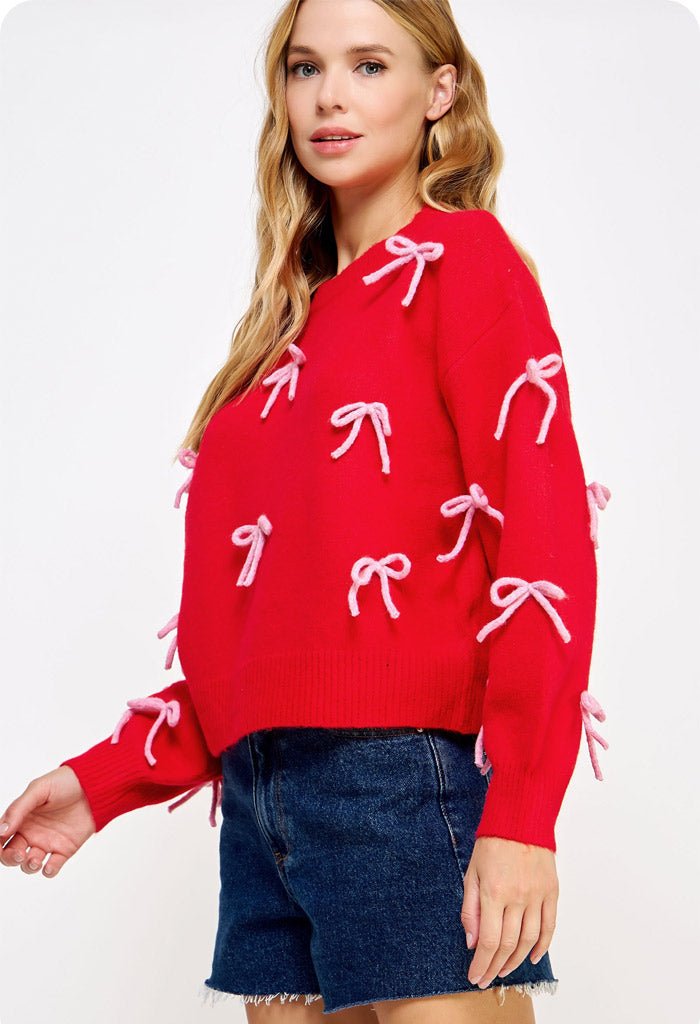 Looking for an extra special touch to your outfit? This adorable pullover sweater will have you feeling sweet as can be. Adorned with pink bows in a cozy knit style. the Crush Sweater is perfect for this season’s festivities. Pair with a chic skirt for some feminine flair or keep it casual in cool jeans and comfy kicks.