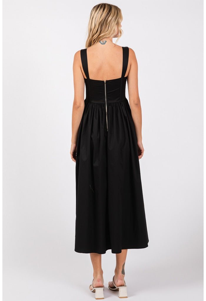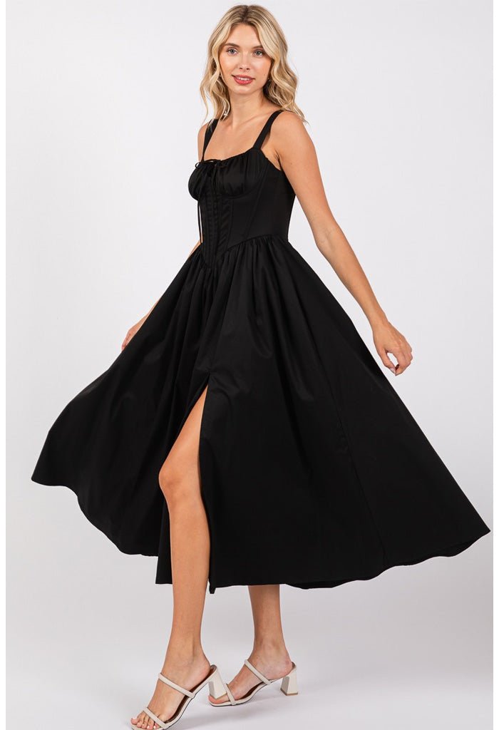 Fall in love with the Daphne Maxi Dress. Sultry and sweet. this stunning maxi features a gorgeous corset bodice with a tie-front neckline and side slit. Slip it on with dainty gems. a cute clutch and strappy heels for a night out.