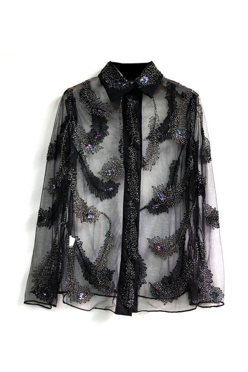 - Long Sleeve, See-through, Embroidered Feather, Collar Beading Details.