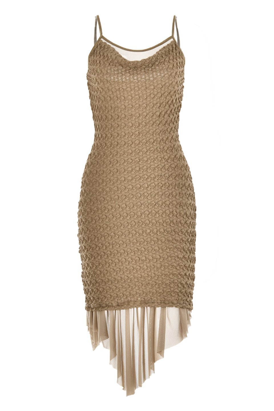 • Cowl Neckline, Layered Design, Textured Puff Chiffon, Slip Dress, Knee Length.