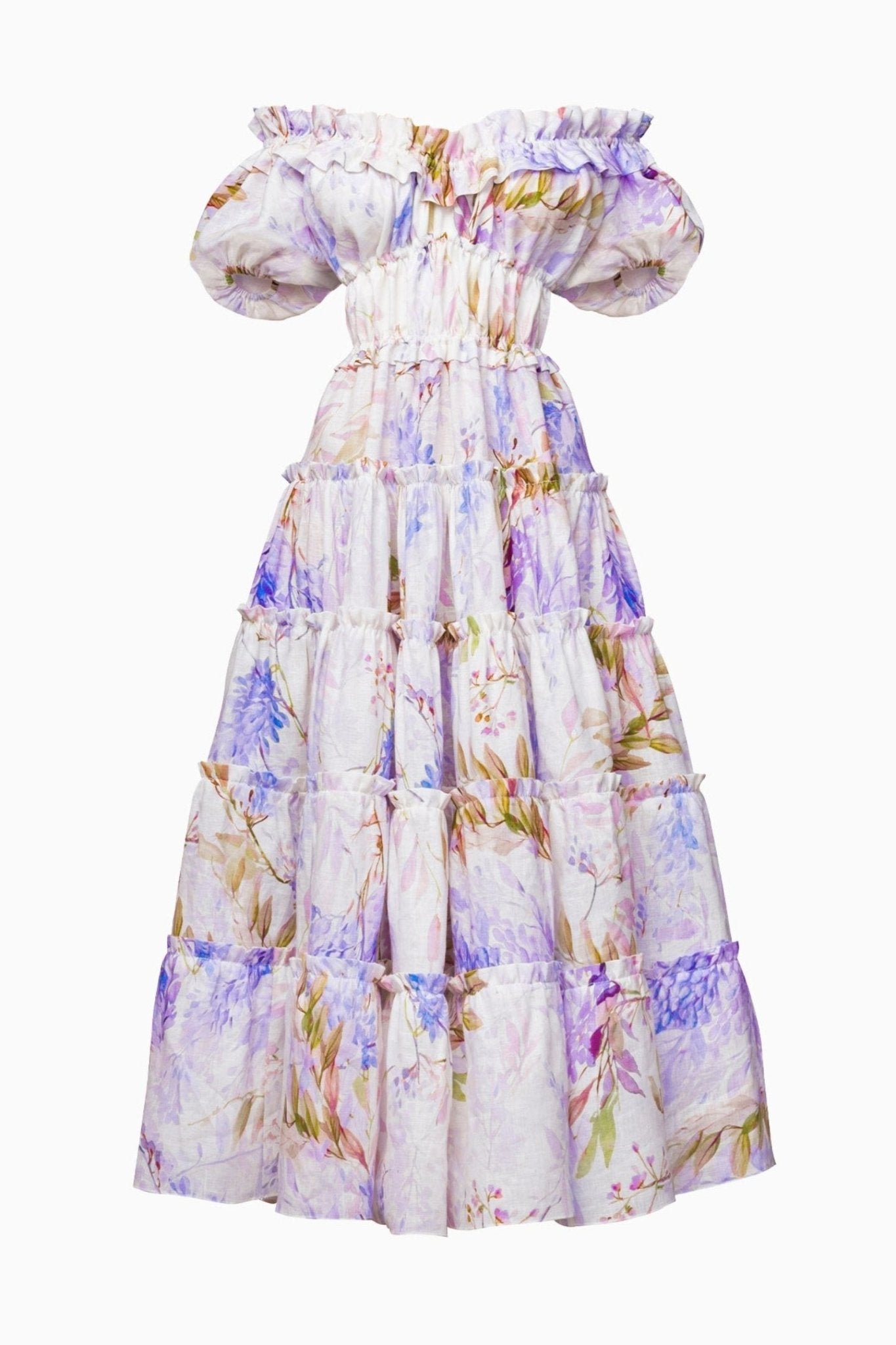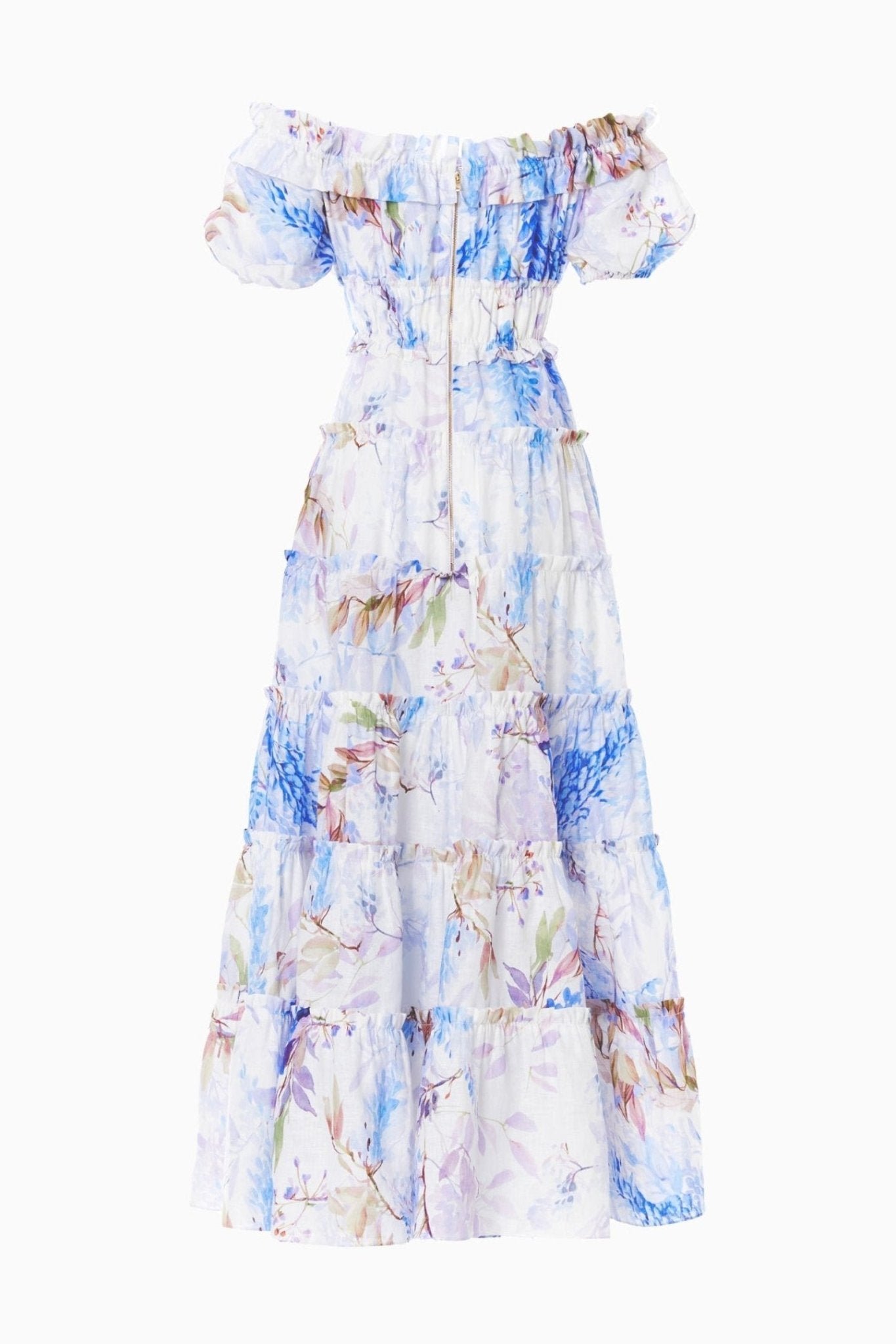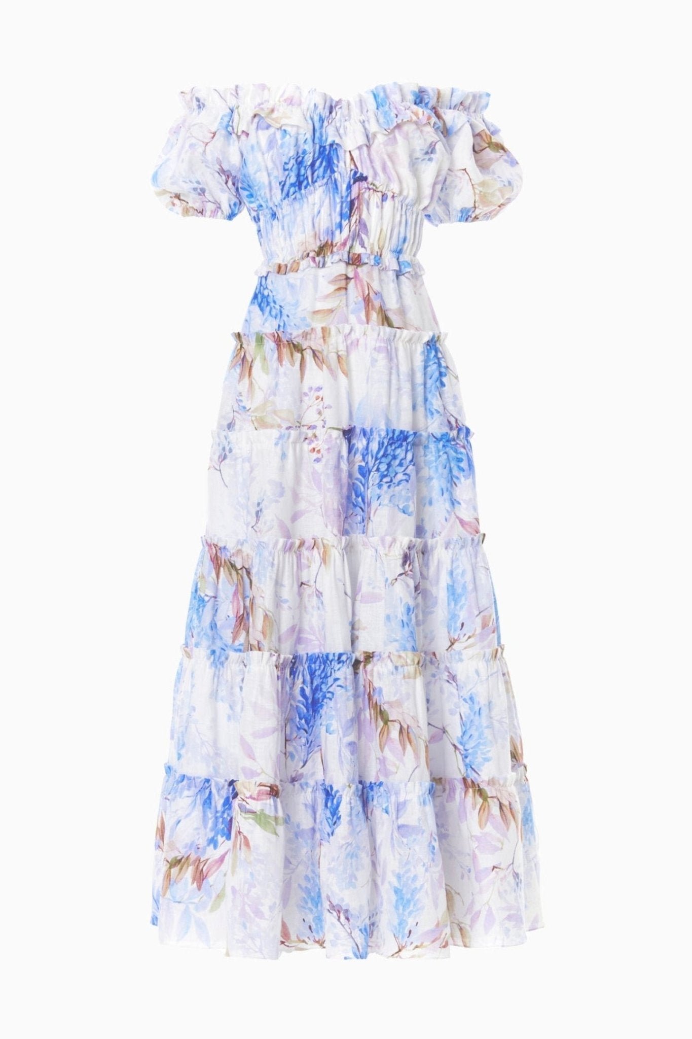 - Floral Printed, Ruffle Off-shoulder Neckline, Puff Sleeves, Gathered Waistline, Tiered Dress, Floor Length.
