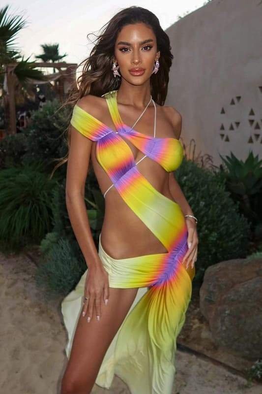 - Round Neck, Sleeveless, Printed Gradient, Cut Outs Detail, Asymmetric Hem, Ruching, Maxi Length.