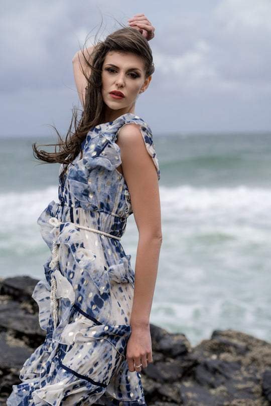 - V-neckline, Ruffle Layered, Metallic Polka Dot Detailing, Mini Length.