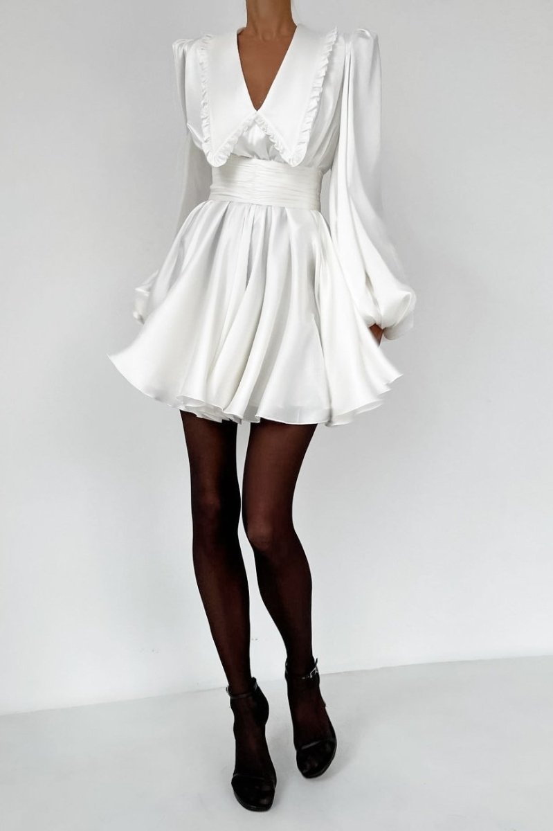 - Deep V Neckline, Peter Pan Collar, A Line, Puff Sleeve, Mini Length.