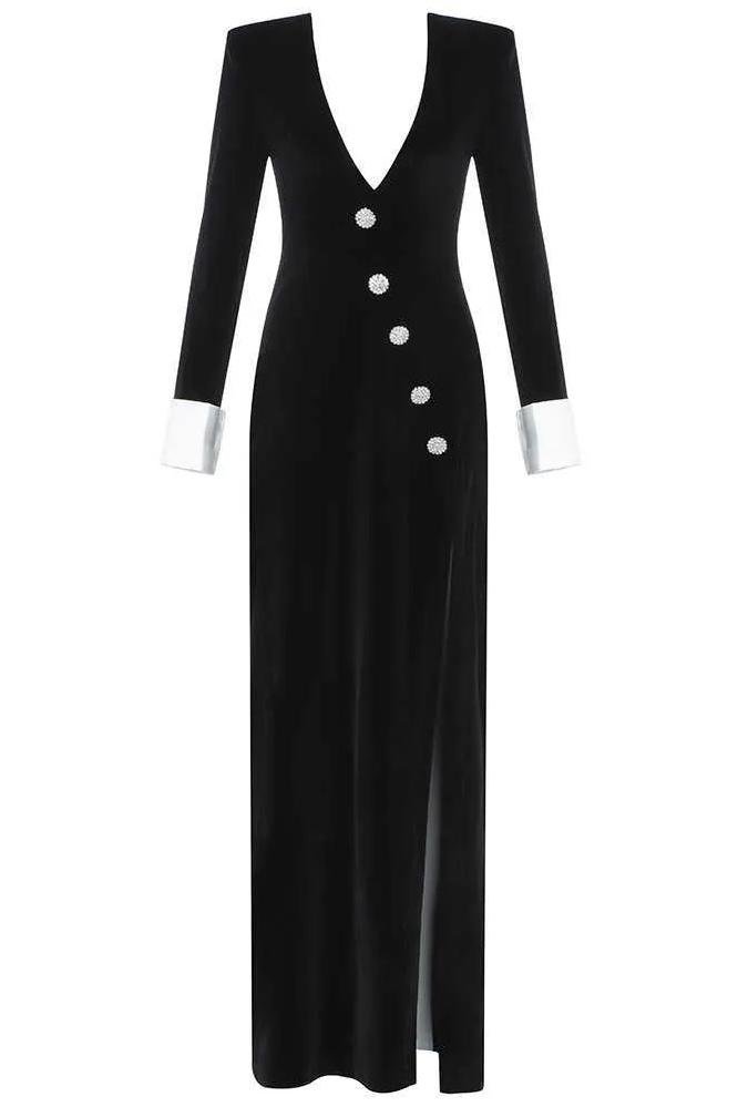 • V-neck, Diamante Button, Padded Shoulder, Contrast Sleeve Cuff, High Slit, Floor Length.