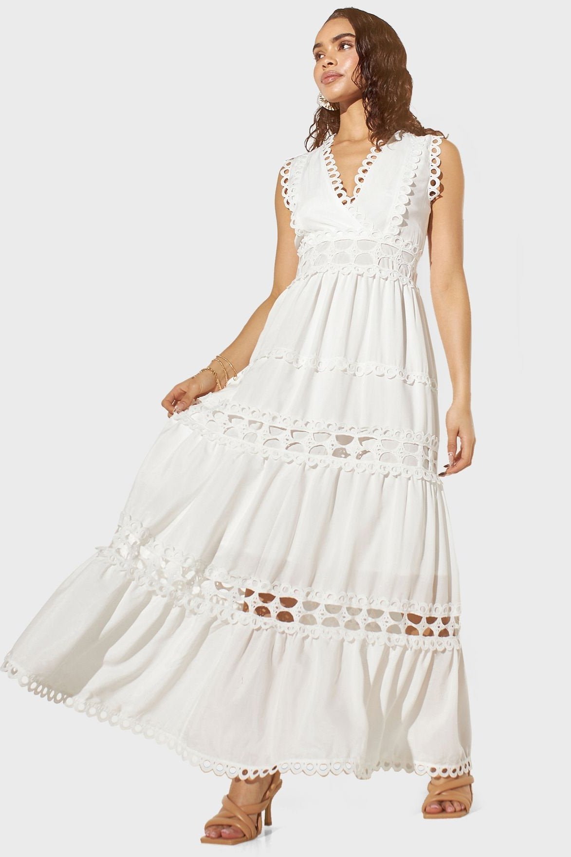 - V-neck, Lace Trimmed, Lace Cut-out Design, Sleeveless, Floor Length.