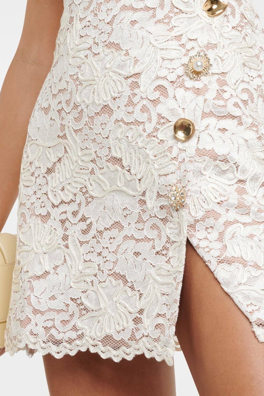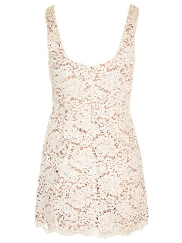 - Scoop Neckline, Sleeveless, Scalloped Hem, Floral Lace, Metal Sculpted Buttons, Mini Length.